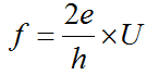 如果在超導(dǎo)結(jié)的結(jié)區(qū)兩端加上一直流電壓V(當(dāng)然,這時(shí)電流大于臨界電流),在結(jié)區(qū)就出現(xiàn)高頻的超導(dǎo)正弦波電流,其頻率與所施加的直流電壓成正比,有如下關(guān)系式